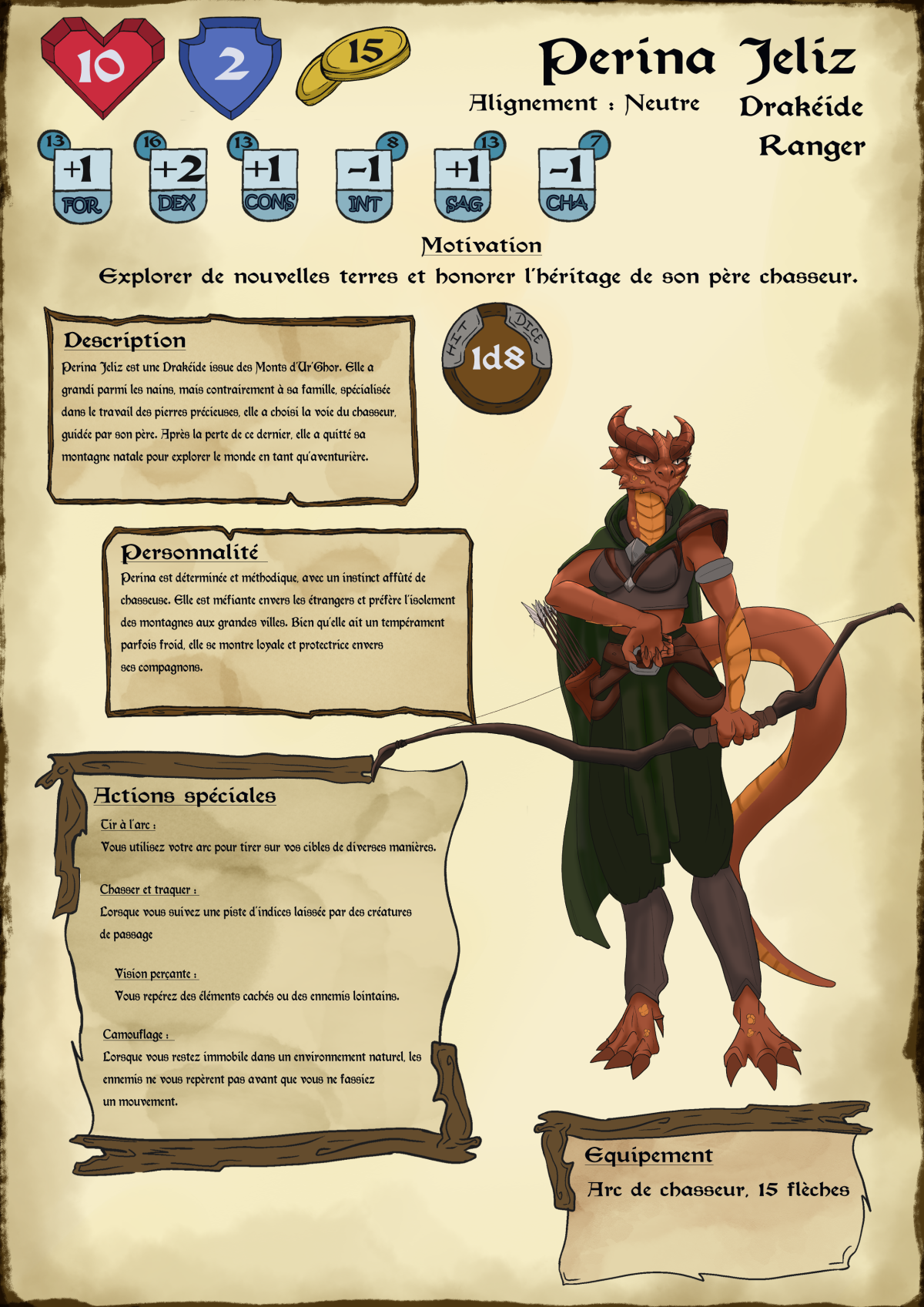 Perina Jeliz est née dans les profondes et fumantes Montagnes d’Ur’Ghor, où réside presque toute la population de Drakéides. Ces créatures à la peau écailleuse et aux traits draconiques vivent en harmonie avec les nains de Karag-Volken, une cité majestueuse, connue pour ses forgerons de talent et sa richesse en pierres précieuses.Les Drakéides des Monts d'Ur'Ghor ont une affinité naturelle pour les joyaux et les trésors que ces montagnes volcaniques recèlent. La plupart de ses amis et de son peuple se sont rapidement tournés vers l’artisanat, en particulier la taille des gemmes et le travail des pierres, un domaine où leurs talents innés et leur collaboration avec les forgerons nains sont inégalés. Mais Perina, elle, a suivi une voie différente.Perina est née dans une famille de chasseurs, héritant des compétences de son père, un Drakéide respecté pour sa bravoure et son talent de pisteur. Depuis son plus jeune âge, elle se montrait fascinée par la nature sauvage et les techniques de chasse que son père lui enseignait. Il lui apprit l’art de se mouvoir sans un bruit, de surveiller les créatures des montagnes, et d’utiliser l’arc avec une précision mortelle. Pour Perina, cette vie de traqueuse et d’archère représentait la liberté, bien au-delà de l’appel des gemmes et des forges. Elle se sentait pleinement vivante dans la nature rude des montagnes, aux côtés de son père.Mais tout changea lorsque son père contracta une maladie grave. Les meilleurs guérisseurs de Karag-Volken tentèrent de le soigner, mais en vain. Perina le perdit, et avec lui, une partie d’elle-même. Sa tristesse était telle qu’elle ne pouvait plus arpenter les mêmes montagnes où elle avait passé tant de moments heureux à ses côtés. Chaque sentier, chaque vue sur les pics enneigés lui rappelait son père et la douleur de sa perte.C’est cette tristesse qui la poussa à prendre la route, quittant son foyer dans les Monts d’Ur’Ghor pour partir à l’aventure. Elle espérait que la distance et le changement lui permettraient de tourner la page et d’apaiser le poids de son deuil. Avec son arc et les compétences que son père lui avait transmises, Perina se mit à parcourir le vaste monde d’Eryndor, offrant ses talents de chasseuse et d’archère.Au fil de ses voyages, Perina a rencontré d'autres aventuriers et a prouvé sa valeur dans des situations de combat. Sa maîtrise de l’arc, sa connaissance des terrains montagneux, et son expérience en survie font d’elle une alliée précieuse pour tout groupe. Bien qu’elle ait quitté les Monts d’Ur’Ghor, elle reste profondément attachée à ses racines drakéides et aux enseignements de son père, et elle espère que, quelque part sur les routes d’Eryndor, elle trouvera la paix intérieure.