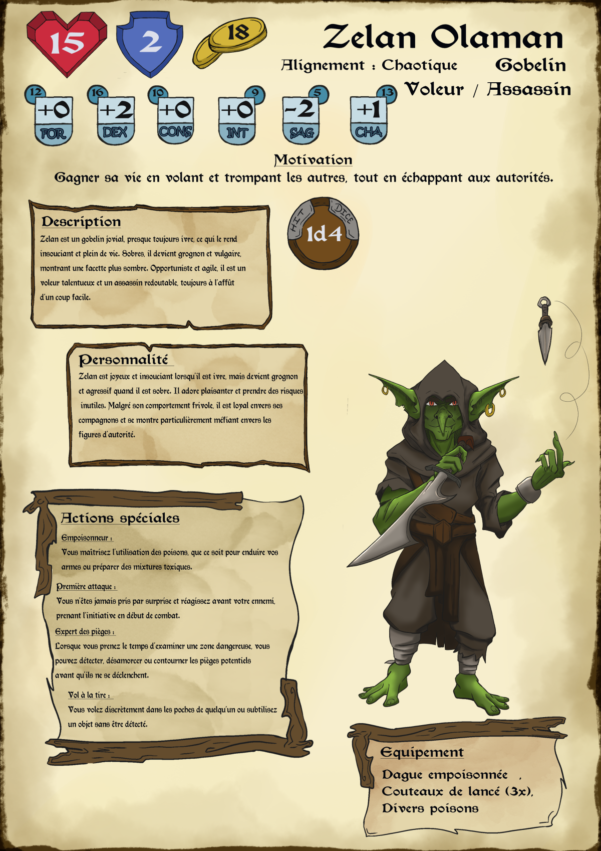 Zelan Olaman est un gobelin assassin originaire des quartiers pauvres de Beldhadria, où il fut élevé par une guilde d’assassins. Habile dans l’art du poison et des missions discrètes, il se fit un nom parmi les siens, mais sa vie bascula lorsque les autorités démantelèrent sa guilde, le forçant à fuir. Depuis, Zelan est en cavale, recherché par la justice, et trouve refuge dans l’alcool pour échapper aux souvenirs de son passé violent. Aventurier pour subvenir à ses besoins, il reste constamment vigilant, dissimulant ses traumatismes derrière une attitude insouciante et joviale, bien qu’il redoute d’être capturé un jour.